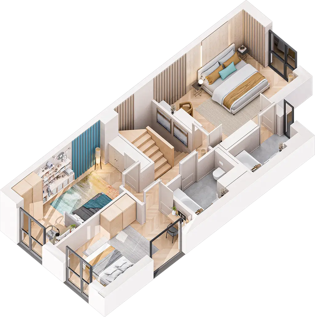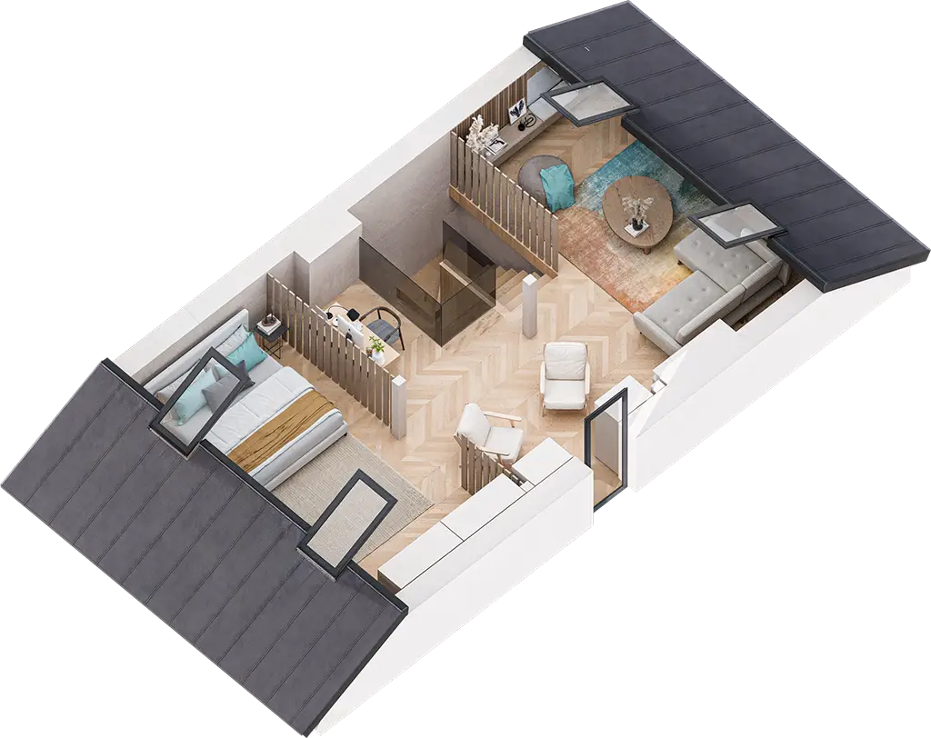 ETAP 1: 125 m2 (segmenty skrajne) lub 131m (segmenty środkowe), na którą składać się będą między innymi kuchnia, użytkowy salon, trzy sypialnie z dużą łazienką oraz otwarta przestrzeń na poddaszu pozwalająca na wygospodarowanie łazienki, bawialni, gabinetu oraz mini siłowni. Do każdego segmentu przynależeć będą dwa miejsca postojowe.